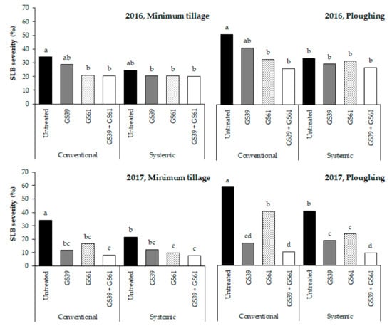 Effect of the fungicide seed 1 and foliar 2 treatments on Septoria Leaf Blotch (SLB) in different soil tillage and growing seasons (2015–2016 and 2016–2017) in North-Italy at the early dough stage (GS83). The bars in each experiment with different letters are significantly different (p-value < 0.05), according to the REGW-F test. The reported values are based on four replications. 1 Fungicide seed treatments: conventional (fludioxonil AI) and systemic (fluxapyroxad AI). 2 Fungicide foliar treatment: untreated control; GS39, a single treatment at the end of stem elongation (pyraclostrobin + fluxapyroxad AI); GS61, a single treatment at the beginning of flowering (epoxiconazole + metconazole AI); GS39 + GS61, a double treatment through a combination of the GS39 and GS61 applications.