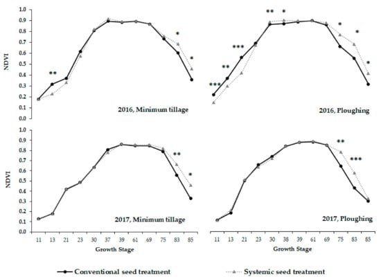 Effect of fungicide seed treatments 1 on the normalized difference vegetation index (NDVI) measured from the first unfolded wheat leaf (GS11) to the soft dough stage (GS85) in different soil tillage and growing seasons (2015–2016 and 2016–2017) in North-Italy. ANOVA was performed for each NDVI value: * significant difference at the <0.05 level; ** significant difference at the 0.01 level; *** significant difference at the <0.001 level. The reported data are based on four replications of the untreated control, without any foliar fungicide. 1 Fungicide seed treatments: conventional (fludioxonil AI) and systemic (fluxapyroxad AI).