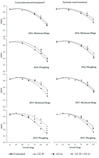 Effect of the fungicide foliar treatments 2 on the normalized difference vegetation index (NDVI) measured from anthesis (GS61) until the soft dough stage (GS85), considering the seed treatments, soil tillage, and growing seasons (2015–2016 and 2016–2017). The reported values are based on four replications. 1 Fungicide seed treatments: conventional (fludioxonil AI) and systemic (fluxapyroxad AI); 2 Fungicide foliar treatment: untreated control; GS39, a single treatment at the end of stem elongation (pyraclostrobin + fluxapyroxad AI); GS61, a single treatment at the beginning of flowering (epossiconazole + metconazole AI); GS39 + GS61, a double treatment through a combination of the GS39 and GS61 applications.