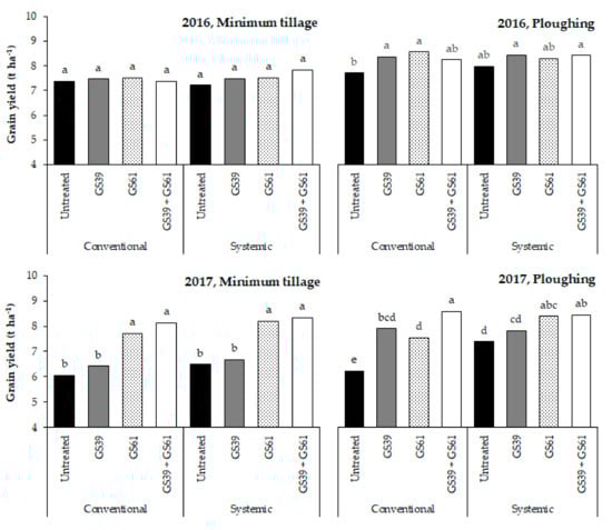 Effect of the fungicide seed 1 and foliar 2 treatments on the grain yield under different soil tillage conditions and in different growing seasons (2015–2016 and 2016–2017) in North-Italy. The bars in each experiment with different letters are significantly different (p-value < 0.05), according to the REGW-F test. The reported values are based on four replications. 1 Fungicide seed treatments: conventional (fludioxonil AI) and systemic (fluxapyroxad AI); 2 Fungicide foliar treatment: untreated control; GS39, a single treatment at the end of stem elongation (pyraclostrobin + fluxapyroxad AI); GS61, a single treatment at the beginning of flowering (epossiconazole + metconazole AI); GS39 + GS61, a double treatment through a combination of the GS39 and GS61 applications.