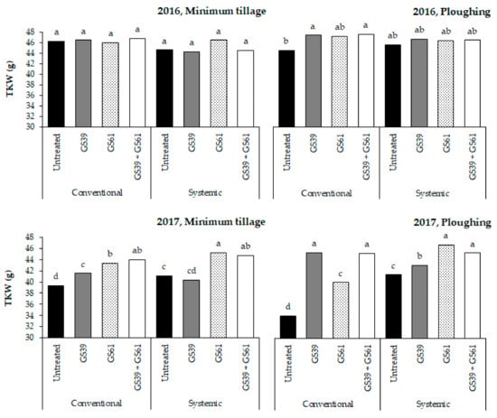 Effect of fungicide seed 1 and foliar 2 treatments on the thousand kernel weight (TKW) under different soil tillage conditions and in different growing seasons (2015–2016 and 2016–2017) in North Italy. The bars in each experiment with different letters are significantly different (p-value < 0.05), according to the REGW-F test. The reported values are based on 4 replications. 1 Fungicide seed treatments: conventional (fludioxonil AI) and systemic (fluxapyroxad AI); 2 Fungicide foliar treatment: untreated control; GS39, a single treatment at the end of stem elongation (pyraclostrobin + fluxapyroxad AI); GS61, a single treatment at the beginning of flowering (epossiconazole + metconazole AI); GS39 + GS61, a double treatment through a combination of the GS39 and GS61 applications.