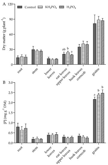 Once the plants had fully ripened, no significant differences were seen in their dry matter, except for the cob leaves and the leaves above them (Figure 4A). At maturity, the P concentrations in the roots were below a value of 1.0 mg P g−1 DM, which was however higher than the P concentrations of the individual shoot sections, which were below a value of 0.5 mg P g−1 DM, except for the P concentration in maize grains. In the individually studied plant regions, no significant differences were detected among the three treatments, even in the lower parts of the plant (root, stem, lower leaves), with the exception of the maize grains (Figure 4B). However, the measurement of the P concentration in the maize grains showed a significant increase in the groups with additional foliar fertilization compared with the control. At 2.39 mg P g−1 DM for the treatment with KH2PO4 and 2.47 mg P g−1 DM for the treatment with H3PO4, the concentrations were at similar levels, regardless of the foliar-applied P form. The P concentration in the control group was 13% lower at 2.17 mg P g−1 DM.