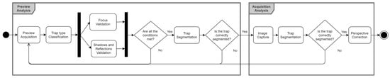 The application relies on a set of computer vision algorithms that guides the user through the image acquisition process, and automatically acquires the image without the need of the user’s interaction when the quality and adequacy conditions of the image are automatically validated. The proposed methodology can be divided into two main steps: the Preview Analysis and the Acquisition Analysis, responsible for the processing of each camera preview frame and the acquired trap image, respectively (see Figure 1).