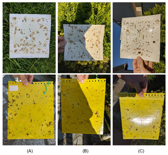 In order to develop the automatic approaches for image quality and adequacy assessment, a dataset of 516 images was collected with trap images captured with different smartphones, in controlled and non-controlled environments, as well as simulating scenarios where the acquired images are out of focus, or with shadows and reflections present. In particular, the authors started by collecting a subset in a laboratory setting under well-controlled conditions (see Figure 2) using 28 traps previously collected on the field. This dataset was then complemented by a subset of trap images collected in a non-controlled environment, i.e., in three different vineyards by the target end-users of the system (winegrowers), during their weekly procedure to monitor the deployed traps (see Figure 3). It should be noted that both controlled and non-controlled subsets include DT and CT, with resolutions from 1224 × 1632 px to 2988 × 5312 px. The distribution of the images regarding the acquisition environment and trap type is shown in Table 1.