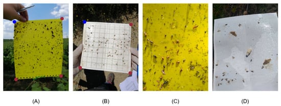 The use of automated image capture technology to monitor insect pest populations in applied research experiments [5,6,7] and commercial settings [8,9,10,11,12] has proven effective for timely pest management in various cultivated crop systems, including vineyards. Many of these image capture technologies facilitate automated image acquisition of traps that are set at a fixed distance and within optimal focus. Some of these automated insect trap setups ensure that the acquired images are free from shadows or specular reflections to enable remote insect identification and automate pest enumeration [7,13]. However, some automated trap setups still rely on static systems that require proprietary traps or enclosures, where the sticky trap must be assembled [5,6].