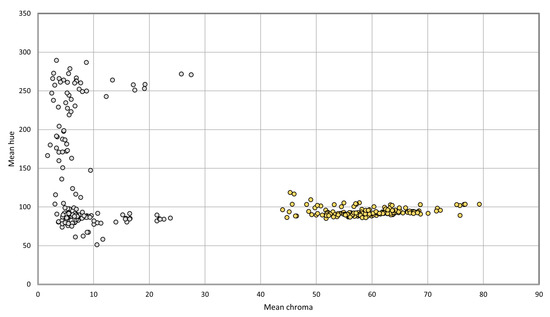 Data distribution of mean Hue and Chroma values for DT (grey) and CT (yellow).