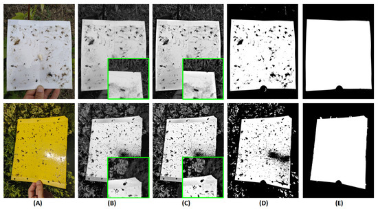 Trap segmentation: (A) original RGB image; (B) grayscale image; (C) sharpening; (D) Otsu’s segmentation; (E) post-processing (morphological operations, area filtering, and hole-filling).