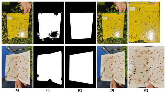 Both DT and CT have usually square or rectangular shapes, but, when viewed from different perspectives, they can assume distinct quadrilateral shapes in the image (e.g., trapeziums). In order to standardize the image capture of traps and turn it independent of the perspective selected by the user during the image acquisition process, a perspective correction methodology was used to ensure that the trap in the corrected image will always have a square or rectangular shape. This approach receives as input the segmentation mask previously obtained (see Figure 7B), and, in order to find the four corners of the trap, a polygonal approximation method was applied based on the Douglas–Peucker algorithm [32]. The method recursively approximates the polygon obtained from the convex hull of the trap contours to another polygon with just four vertices, so that the distance between them is less or equal to the specified precision (see Figure 7C). The resulting corners are sorted (see Figure 7D), and used to compute the 3 × 3 perspective transform matrix [33], leading to the desired perspective transformation (see Figure 7E).