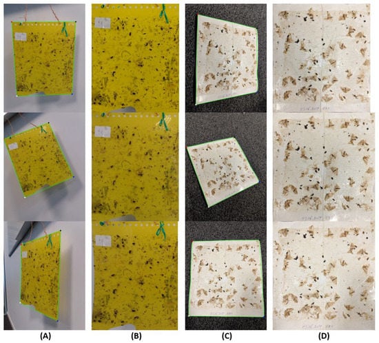 In order to illustrate the suitability of the perspective transform procedure when a good trap segmentation is achieved, in Figure 9, we show three photos acquired with abrupt perspective changes for the same trap. As we can see in the perspective transform result, regardless of the perspective in which the images were acquired, the corrected image is always remarkably similar, which highlights the potential of this approach to standardize the image acquisition process of insect traps. However, it should be noted that images which need demarked perspective corrections (e.g., bottom CT image (A) in Figure 9 will be impacted in terms of image quality, regardless of the successful transformation to the rectangular shape. Image pixelization on the corrected image might be one of the side effects, since the objects in the demarked perspective have less pixels to represent them.