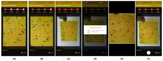 Based on the results reported in previous sections, the proposed pipeline was deployed as an Android application, in order to ensure that the mobile-acquired trap images present the required level of adequacy and quality. In particular, the developed application integrated all the previously referred modules in the sequence depicted in Figure 1, providing real-time feedback to the user during preview analysis in terms of: (i) focus assessment; (ii) shadow and reflections assessment; (iii) trap type detection; and (iv) trap segmentation. When a set of consecutive frames passes those conditions (in order to ensure stability), an image is automatically acquired (see Figure 10A–D), the perspective correction procedure being further applied (see Figure 10E).