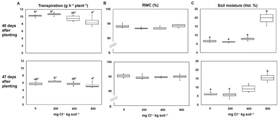 The effect of increasing chloride (Cl―)-fertilization on plant and soil water relations. Transpiration per plant (A), RWC (B), and soil moisture (C) at 40 days (above) and 47 days (below) after planting. Plants were treated with four Cl― supplies: 0 mg Cl― kg soil−1 (control plants); 200 mg Cl― kg soil−1; 400 mg Cl― kg soil−1; 800 mg Cl― kg soil−1. Mean ± SE values; n = 4. Different lowercase letters indicate significant differences between Cl― treatments determined by multiple contrast test. No given letter means there was no significant effect. Levels of significance: p < 0.05; * = p < 0.1.