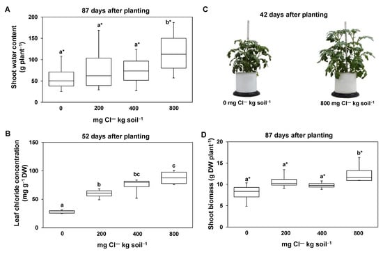 The effect of increasing chloride (Cl―)-fertilization on leaf chloride concentrations, shoot biomass, and shoot water content. Shoot water content at harvest (87 days after planting) (A), leaf Cl― concentrations 52 days after planting (B), representative phenotypes of plants being treated by 0 or 800 mg Cl― kg soil−1 (folding rule: 62 cm) at 42 days after planting (C), and shoot biomass at harvest (D). Plants were treated with four Cl― supplies: 0 mg Cl― kg soil−1 (control plants); 200 mg Cl― kg soil−1; 400 mg Cl― kg soil−1; 800 mg Cl― kg soil−1. Mean ± SE values; n = 4. Different lowercase letters indicate significant differences between Cl― treatments determined by multiple contrast test. Levels of significance: p < 0.05; * = p < 0.1.
