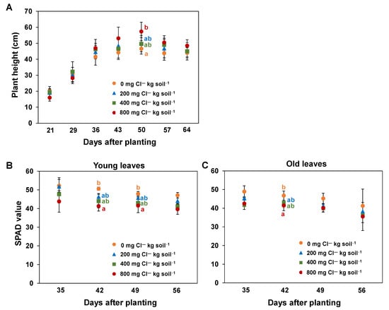 The effect of increasing chloride (Cl―)-fertilization on plant height and relative leaf chlorophyll concentrations. Plant height at seven different times during the growth period from day 21 to day 64 after planting (A) and relative chlorophyll concentrations indicated by the dimensionless SPAD value in young (B) and old leaves (C) at four different times during plant growth from 35 until 56 days after planting. Plants were treated with four Cl― supplies: 0 mg Cl― kg soil−1 (control plants); 200 mg Cl― kg soil−1; 400 mg Cl― kg soil−1; 800 mg Cl― kg soil−1. Mean ± SE values; n = 4. Different lowercase letters indicate significant differences between Cl― treatments at one time point and one plant age (young or old leaves) determined by multiple contrast test. Levels of significance: p < 0.05.