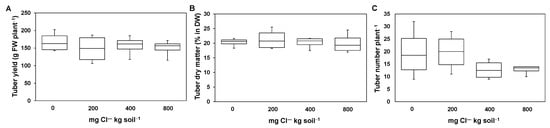 The tuber yield, the tuber dry matter, and the tuber number were not significantly affected by the Cl― treatment (Figure 4). However, there was a trend of a smaller number of tubers in plants supplied with 400 mg Cl― kg soil−1 and 800 mg Cl― kg soil−1 when compared to the other two treatments (Figure 4C).