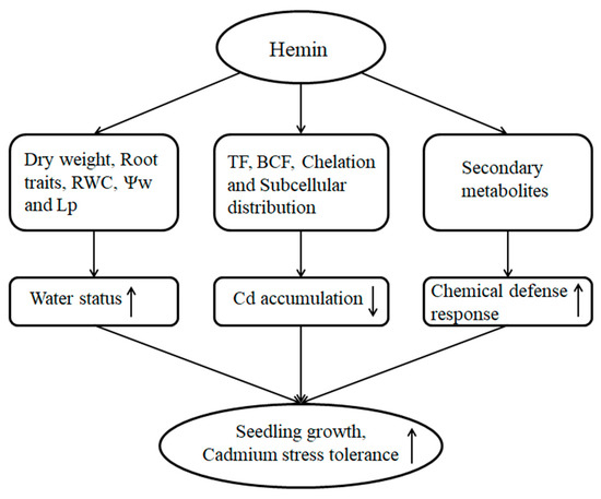 Schematic representation of the positive role of hemin on tolerance of maize to Cd stress. A model was developed to show that water status, Cd concentration, and chemical defense response were regulated by hemin in maize under Cd stress. The arrows (↑) and (↓) represent the positive and passive roles of hemin, respectively.