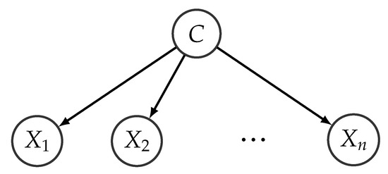 BNs have been successfully used for classification tasks. The simplest BN classifier is the Naive Bayes (NB) [37], a fixed structure whose class variable C is the the parent of all remaining variables , and these are considered independent of each other given C (Figure 2). This strong independence assumption is compensated by the reduction in the number of parameters to be estimated from data, since in this case, it holds that: