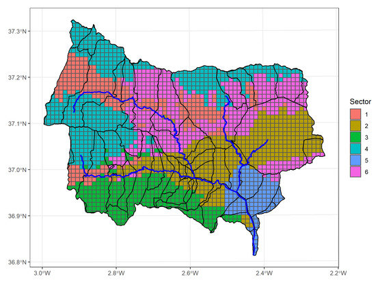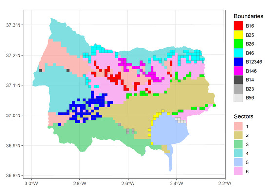 The catchment selected as a case study comprises a complex socio-ecological system, whose main characteristic is its heterogeneity, which was easily handled by the method proposed. In this sense, the obtained sectors identified the socio-ecological spatial structure of the catchment through (i) its altitudinal gradient, comprising Sector 3 (medium-high mountains with scarce crops), Sector 4 (high mountains with high dominance of pine tree forest) and Sector 6 (foothills, with high emigration rate and aging population); (ii) its main river gradient, comprising Sector 1 (corresponding to the headwaters of the main rivers, with high presence of homogeneous crops), Sector 2 (middle course of the rivers, with rainfed olive groves and Mediterranean shrubs) and Sector 5 (low course of the Andarax river, corresponding to the wealthiest region of the catchment); and (iii) a socioeconomic tendency, from Sector 6 (higher emigration rate and older people) to Sector 5 (younger people and high IPC). Furthermore, the probabilistic model allowed the identification of boundaries between different sectors, which behave as socio-ecological transition zones. Identifying these boundary zones is utterly important for landscape planning since they can act as alert systems for climate, land-use or socio-economic changes, which may affect the socio-ecological structure of the landscape and, therefore, its functions and provision of benefits to society.