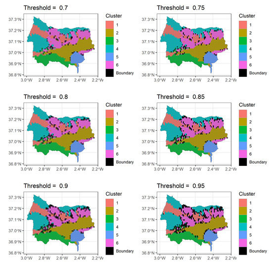 Figure 4 shows the boundary zones found using different thresholds, t = {, , , , , }. The boundary zones are already visible from the lowest threshold (), and they get thicker as the threshold gets higher, i.e., as t increases, so does the size of the boundary area. This is due to adding additional observations to the ones previously classified as boundary. Further analyses were performed for the boundaries found with , as they are larger.