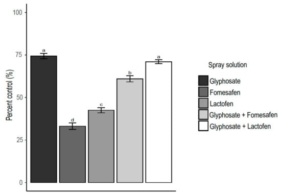 In general, less control was observed when using applications of fomesafen alone compared to lactofen alone (except for common lambsquarters). Observations from this research using fomesafen versus lactofen have been consistent with other findings. For example, less control was reported using fomesafen at 280 g ha−1 compared to lactofen at 213 g ha−1 in four pigweed species across two locations at 21 DAT [36]. Higher fomesafen rates have been reported to increase the control of Palmer amaranth [37] and common waterhemp [38]. For instance, Bond et al. [39] reported 96% Palmer amaranth control based on visual ratings at 21 DAT using fomesafen at 420 g ha−1 when plants were 15 cm.