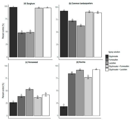 Percent of (a) sorghum, (b) common lambsquarters, (c) horseweed, and (d) kochia control based on dry biomass at 28 DAT treated with different herbicide tank-mixtures averaged across nozzle types evaluated from a greenhouse study conducted in 2016. Bars with same letter do not differ using Tukey post-hoc test at α = 0.05.