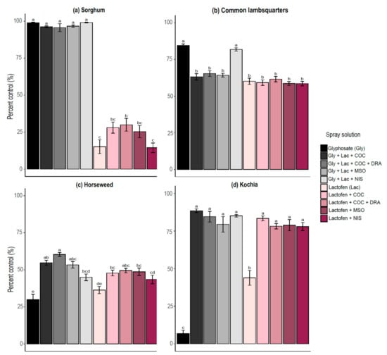 Percent of (a) sorghum, (b) common lambsquarters, (c) horseweed, and (d) kochia control based on dry biomass at 28 DAT treated with different herbicide tank-mixtures as affected by the addition of different adjuvants and averaged over nozzle types evaluated from a greenhouse study conducted in 2017. Bars with same letter do not differ using Tukey post-hoc test at α = 0.05.