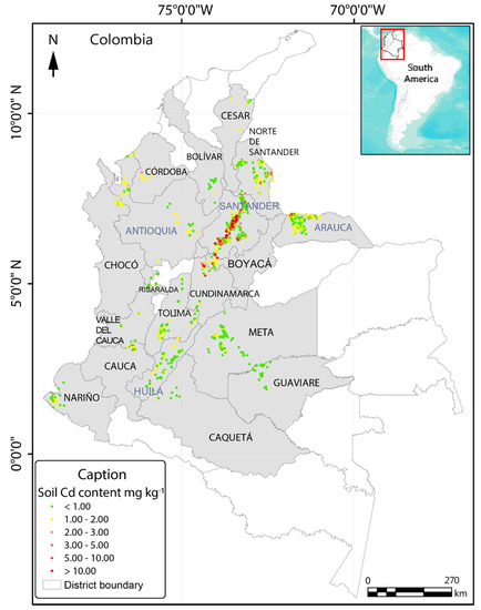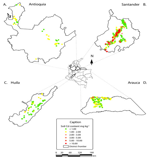 However, it is important to note that the methodologies, sampling techniques, and analytical parameters of the studies were quite different from each other, so the results are not comparable. Nonetheless, because the highest values coincided spatially, more-detailed research of the Santander district should be conducted. For example, in the municipality of San Vicente de Chucurí, located in Santander, the Umir formation, which is a lithostratigraphic unit of the upper cretaceous system, is widely distributed. That formation has a thickness between 800 m and 1400 m, made up of sedimentary rocks like lodolites and claystones and some bituminous coal [54]. Bituminous coal mantles have been evaluated in the Ranchería and Cesar basins, where soil cadmium content above the world averages in the Earth’s crust were found [55].