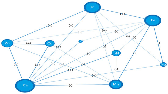 Estimated partial correlation networks were very similar when using Cd precorrected for laboratory effect or Cd without precorrection, so, the analysis based on Cd is discussed (see Supplementary Tables S2 and S3). According to these results, Ca, P, and Fe had the highest estimated degrees, while K and Mg had the lowest. Regarding estimated partial correlations, those between Cd and Zn (0.34), Ca and pH (0.22), and Ca and Cd (0.18) were the largest (Supplementary Table S2). The estimated network density (the ratio of the number of non-null partial correlations to 0.5 × p × (p − 1), the number of partial correlations) was 0.6389. Table S3, shows the estimated degrees (number of connections to other nodes) of each variable. Figure 2 shows the inferred partial correlation network.