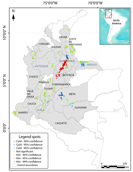 The main Cd content in the soil by district is shown in Table 1. The Santander district proved to have the highest numbers of both soil samples (821) and hotspots (660). The mean value and the standard deviation (SD, represented by the symbol ±) of Cd in Santander were 2.18 ± 3.58 mg kg−1 in hotspots, 0.51 ± 0.57 mg kg−1 in coldspots, and 1.02 ± 1.26 mg kg−1 in a nonsignificant range. In contrast, the other districts did not show hotspots, and in the Antioquia district, there were no coldspots either. In the Arauca district, the mean and SD Cd level were 0.94 ± 0.40 mg kg−1 in coldspots and 1.26 ± 0.71 mg kg−1 for nonsignificant values. In Huila, the Cd mean, and SD values were 0.75 ± 0.24 mg kg−1 in coldspots and 0.86 ± 0.26 mg kg−1 in the nonsignificant range, whereas in the Antioquia district, the mean and SD Cd content in the soil were 1.14 ± 0.39 mg kg−1. The SD is higher than the mean in several cases due to the high scatter of the data in the hotspot and coldspot analysis.