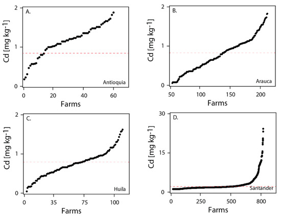 Figure 4 shows the distribution of Cd in soils from 4 out of 19 cacao-growing districts. Of all the districts analyzed here, Santander had the widest range of Cd concentrations showed in Figure 4B, (ranging 0.01–27 mg kg−1), compared to Arauca in Figure 4D (ranging 0.28–5.64 mg kg−1), Huila in Figure 4C (ranging 0.29–1.49 mg kg−1) and Antioquia in Figure 4A (ranging 0.2–1.86 mg kg−1).