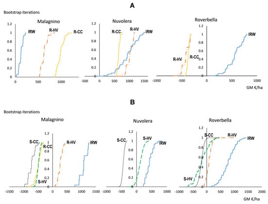 Cumulative distributions of gross margins (GM) for corn in three organic farms of northern Italy (Malagnino, Nuvolera, Roverbella) and two evaluation years (2017, 2018). Based on economic data and elaborated from the field experiment cumulative distribution obtained by 10,000 bootstrap random iterations from gross margin data. (A) Corn in the first year in three locations; (B) corn in the second year in three locations. IRW: inter-row weeding; R-HV: rolled hairy vetch; R-CC: rolled crimson clover; S-HV: shredded hairy vetch; S-CC: shredded crimson clover; R-R-ST.
