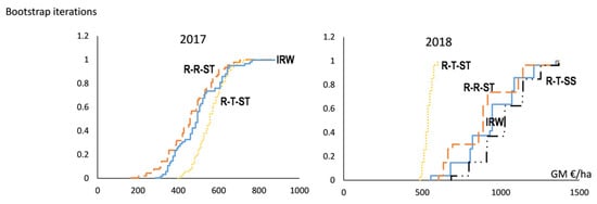 Cumulative distributions of gross margins (GM) for soybean in one organic farm (Roverbella) in two evaluation years (2017, 2018). Based on economic data and elaborated from the field experiment cumulative distribution obtained by 10,000 bootstrap random iterations from gross margin data. R-R-ST: rolled rye, and soybean sowing after strip tilling; R-T-ST: rolled triticale, and soybean sowing after strip tilling; R-T-SS: rolled triticale, and soybean sod seeding on cover crop mulch; IRW: inter-row weeding.