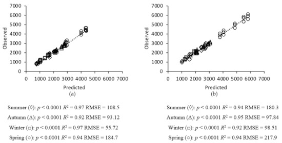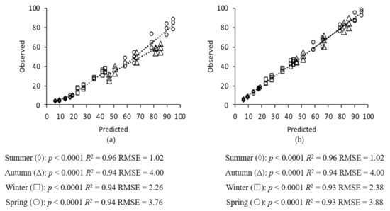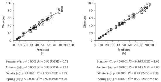 The dataset used for validation of the models was obtained from samples collected in the same experimental plots (n = 300). This dataset was not used in the model development. Thus, models were cross-validated by evaluating the percent variation of data that could be explained by the model [25,26]. The percent variation was considered the coefficient of determination (R2) and was associated with the coefficient of correlation, which was developed using minimum squares [27].