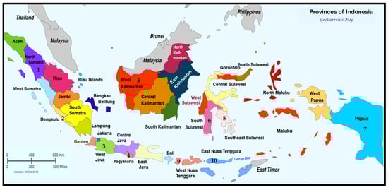 Map locating the ten provinces of Indonesia designated as study areas. The numbers indicate the provinces, as shown in Table 1.