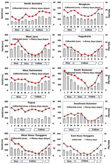Rainfall (left axis, in mm−1), rainy days (right axis, number of rainy days month−1) and the scheme showing existing cropping sequences in rainfed lowland areas in Indonesia’s ten provinces used as study sites, as shown in Table 1. Boxes show approximate crop cycle length, from sowing to harvest maturity.