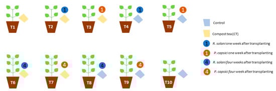 The experiment was carried out in a greenhouse under the following conditions: temperature 24 °C day, 18 °C night and 80% relative humidity. Ten different treatments were considered depending on the CT supply (40 mL was supplied weekly and individually by irrigation), pathogen inoculation, and inoculation time: T1 (CT), T2 (CT + R. solani inoculation one week after transplanting), T3 (CT + P. capsici inoculation one week after transplanting), T4 (Control plants inoculated with R. solani one week after transplanting), T5 (Control plants inoculated with P. capsici one week after transplanting), T6 (CT + R. solani inoculation four weeks after transplanting), T7 (CT + P. capsici inoculation four weeks after transplanting), T8 (Control plants inoculated with R. solani four weeks after transplanting), T9 (Control plants inoculated with P. capsici four weeks after transplanting) and T10 (Control plants without infection) (Figure 1). For pathogen inoculation, the rice grain method was carried out []. Six inoculated rice seeds were placed per pot. Moreover, to determine the effect of CT application, the following plant growth and production parameters were determined: stem diameter measured with a digital caliper, chlorophyll content with a chlorophyll meter Minolta SPAD-502 (both were measured at mid-cycle), dry weight of the root system, and an aerial part (before being weighed, the plants were dried in a P-Selecta-210 oven at 65 °C for 48 h), flowering date, fruit weight, and amount of fruit per plant. The total dry biomass produced per plant was calculated as the sum of the dry fruit, root, and aerial parts. Weights were determined by using a precise balance Sartorius BL150S. Furthermore, the pathogen incidence was also determined following a specific symptom scale (1–5). The experimental design was a randomized complete-block design with eight plants per treatment. This essay was carried out twice during 2017 and 2018.