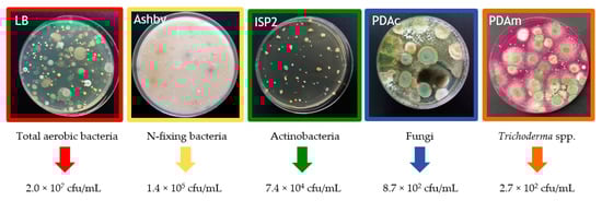 Microbial analysis of the CT was estimated using the serial dilution spread plate method. To determine the microbial population, different selective culture media and CT dilutions were used for microorganism isolation: nutrient agar and 10−3 dilution for total aerobic bacteria, Ashby medium, and 10−2 dilution for N-fixing bacteria, ISP-2 medium and 10−1 dilution for actinobacteria and modified potato dextrose agar medium but no dilution for total fungi and Trichoderma ssp. quantification [,,,]. Then, plates were inoculated by depositing on the agar surface 0.1 mL of the CT dilution, which was spread on the media surface with sterile glass beads. Moreover, non-inoculated plates were included as a negative control. Petri dishes were incubated in the dark at 28 °C for 3 to 15 days, depending on the medium. After this time, colony-forming units (CFU) were counted to estimate the cultivable microorganism’s population. This experiment was conducted using five replications.
