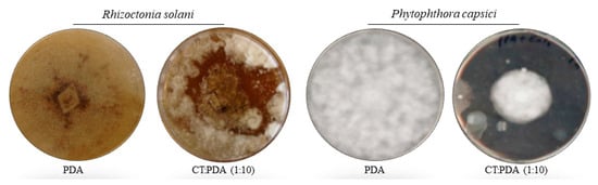 Concerning the inhibitory effect of the CT on the studied fungal pathogens, in vitro assay results showed that the application of CT to PDA (1:10) significantly decreased the growth rate of R. solani and P. capsici in comparison with the control treatment. According to these results, Dionne et al. [] showed that the CT significantly reduced the growth of the mycelium of R. solani. This reduction seems to be related to the high microbiota population, since in our experiment the sterilized CT did not show this direct suppressive effect (data not shown). Hence, CT-enriched media displayed a large number of microorganisms that could directly repress fungi growth. In addition to this statement, several authors have previously written that microbial populations are required to determine the suppressive effect of the CT [,]. Moreover, the CT contains different species of the genera Trichoderma, Penicillium, Aspergillus, Bacillus, Enterobacter, Rhizobacteria or Pseudomonas spp., among others, which could have the ability to control pathogens and stimulate plant growth [,,,].