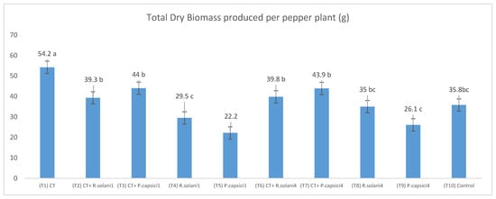 Total dry biomass produced per pepper plant and treatment. T1: CT (compost tea); T2 and T3: CT + pathogen inoculated one week after transplanting; T4 and T5: pathogen inoculated one week after transplanting; T6 and T7: CT + pathogen inoculated four weeks after transplanting; T8 and T9: pathogen inoculated four weeks after transplanting; T10: control. Different letters above the columns indicate significant differences (p < 0.05).