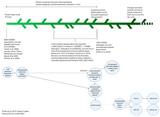 Clearly this is not what proponents of the proto-indica hypothesis intend—as Fuller [59], for example, has shown in the complexity of modelling rice domestication, there was no clear domestication pathway, with many dead ends and branches. However, the species-style use of proto-indica to discuss what is instead the pre-domestication cultivation of nivara rice complicates this and the process-type modelling of the proto-indica hypothesis (Figure 2).