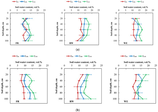 Volumetric soil water content distribution in the three irrigation levels (I50, I100, and I150: 50%, 100%, and 150% crop evapotranspiration, respectively) across three water qualities (FR: freshwater, RW: reclaimed wastewater, and WE: well water) measured at three dates in (a) 2017 and (b) 2018. Bars represent mean values ± standard error of triplicate measurements.