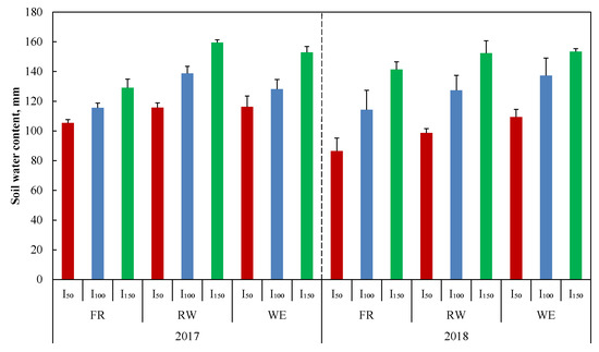 Figure 3 shows the θv values in mm for the soil profiles (100 cm deep) measured over two growing seasons for three irrigation treatments with three different water types. The θv values for the I150 treatment were the highest, followed by the I100 and I50 treatments. Regardless of the irrigation level, the θv value increased on average by 18.22% and 13.47% in 2017 and 10.59% and 16.91% in 2018 for the RW and WE treatments, respectively, compared to those for the FR treatment.