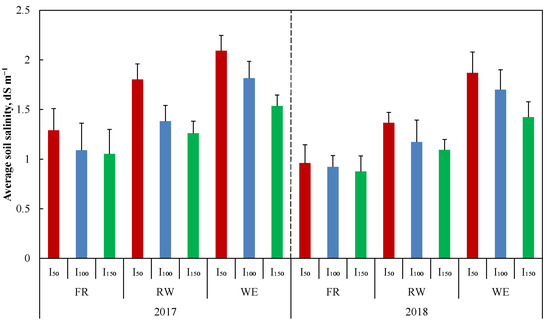 Figure 5 shows that the amount of salt in the 0 to 100 cm deep layer increased with decreasing irrigation water quantity. In 2017, the average salt amounts measured in the I100 and I150 treatments with FR were 15.50% and 18.35%, respectively, which were lower than those scored in the I50 treatment. The corresponding values decreased by 23.29% and 30.13% with the application of RW and 13.22% and 26.59%, respectively, with the WE irrigation. The same trend was obtained in 2018, wherein the I100 and I150 treatments values decreased by 3.82% and 8.68%, 14.15% and 20%, or 9.09% and 23.89% with the application of FR, RW, or WE, respectively.