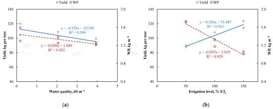 Relationships of (a) water quality and (b) irrigation levels with either yield or water productivity (WP) of date palms from the pooled data obtained during the experimental years.