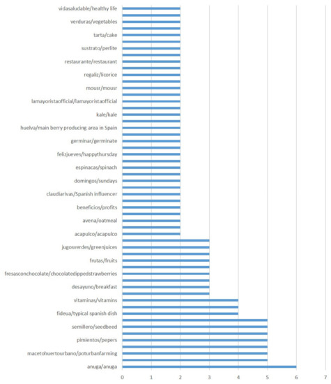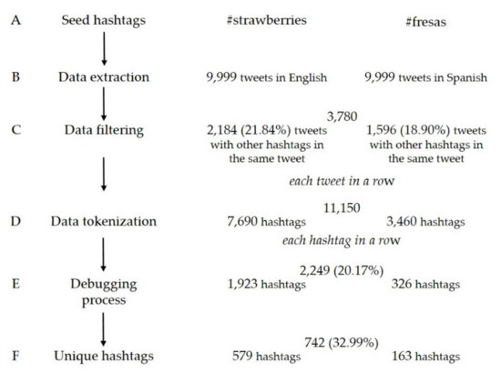 After a filtering, tokenization, and debugging process, a total of 579 unique hashtags for the term ‘strawberries’ and 163 for ‘fresas’ were obtained.