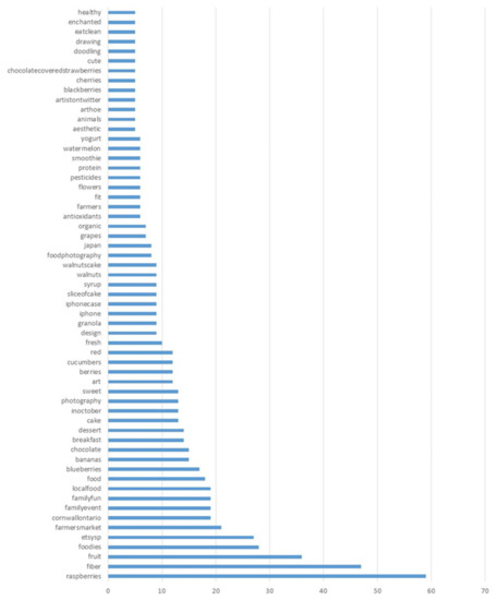 On the other hand, the hashtags frequency analysis of ‘strawberries’ highlighted the association with other fruit (but this time with ‘raspberries’ in addition to ‘blueberries’ and ‘bananas’, and to a lesser extent with ‘blackberries’, ‘grapes’, and ‘watermelon’), health (but this time as ‘fiber’ and with many more terms like ‘organic’, ‘antioxidants’, ‘fit’, ‘eatclean’, and ‘healthy’), sweets (‘chocolate’, ‘cake’, ‘sweet’), and acquaintances or family (‘familyevent’ and ‘familyfun’).