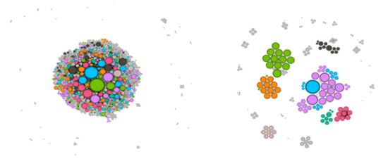 Finally, the nodes in the graphs were colored according to the communities to which they belonged calculated according to the Louvain modularity [83], and the size of the node was represented in the graph proportionally to the number of links (degree).