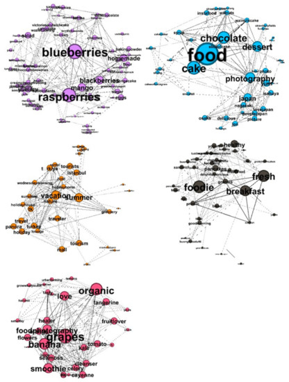 The final procedure was the detection of communities by calculating the modularity [83] (Figure 5 and Figure 6). Overall, five communities appear on the #strawberries network and seven on the #fresas network.