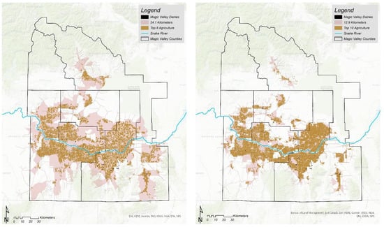 Another data layer contained dairy locations and estimates of dairy cattle numbers throughout the valley. This data layer was compiled using two available maps of dairies in the region: a map available from Idaho Power and Idaho Department of Environmental Quality [,]. These were cross-validated with a shapefile containing cow numbers correlated with water rights holders’ names [] and an ISDA Excel spreadsheet containing dairy cattle numbers and dairy names but no locations []. We verified locations of dairies visually using aerial photography available through Google Earth. Where aerial imagery did not clearly indicate the presence of a dairy at a provisional location, a visual inspection confirmed or eliminated the candidate point. Considering the potential for inaccuracies in exact locations of these dairies, considering the provenance of original sources, and the sensitivity of identifying individual operators, we are not releasing the exact locations with this manuscript. For the purposes of this analysis, the reader can assume that the locations of dairy operations in this analysis are hypothetical, yet reasonable.