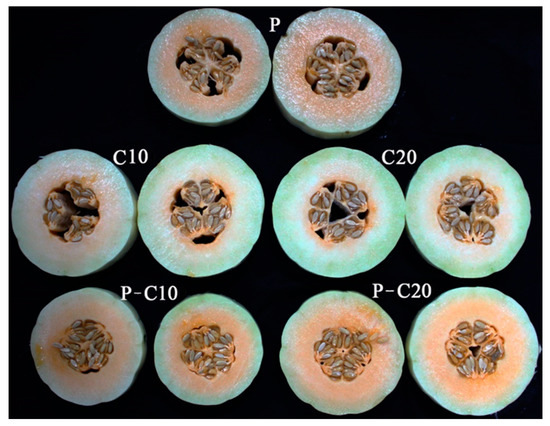 The fruit induced by CPPU treatment without pollination should result in parthenocarpic fruit; thus, the plump seeds in the fruits of each sample group were counted. The average number of plump seeds in the pollinated melon fruit was 712 (93.07% of the total number). In contrast, seeds in the fruit treated with 10 and 20 mg·L−1 CPPU without pollination were all empty. However, in the fruits induced by 10 and 20 mg·L−1 CPPU treatment supplemented with pollination, the numbers of plump seeds were 516 (67.98%) and 543 (63.88%), respectively (Table 1).