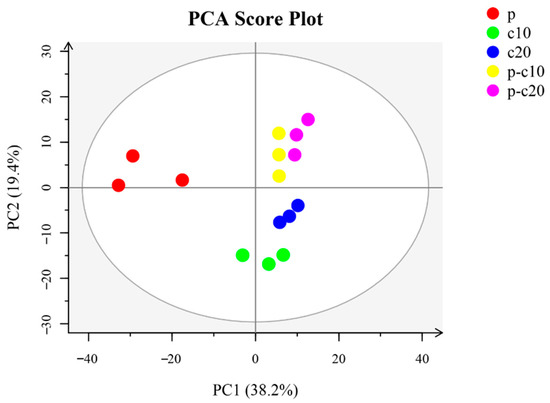 Principal component analysis (PCA) was applied to view the metabolomics data and reveal intrinsic treatment-related clusters. As shown in Figure 2, the data of three replicates for each treatment were clustered tightly together in the PCA score plot, being indicative of good reproducibility and reliability. The control samples (P) were obviously separated from the four CPPU-treated groups in the PCA score plot. In addition, the score plot of the PCA showed that the C10 and C20 samples were clustered tightly together, but they were differentiated from P-C10 and P-C20, indicating that fruit setting by CPPU treatment could significantly influence the volatile constituents of the resulting fruits.